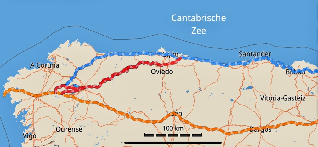 Ik start in Bilbao om van daar, via Santander en Oviedo, naar Santiago de Compostela te lopen. Ik wandel een deel van de ‘Camino del Norte’ en de gehele ‘Camino Primitivo’ (de eerste en oudste pelgrimstocht naar SdC.), in totaal zo’n 650 km. Langs de kust van de Cantabrische zee (de Golf van Biskaje) en de noordelijke binnenlanden van Spanje, met heuvels en bergen. In Lugo sluit Esther zich na vier weken bij mij aan, zodat wij samen de laatste 100 km. naar SdC. kunnen lopen. Afsluitend wandelen we nog zo’n 100 km. naar Finisterre, “het einde van de wereld”, aan de Atlantische kust.